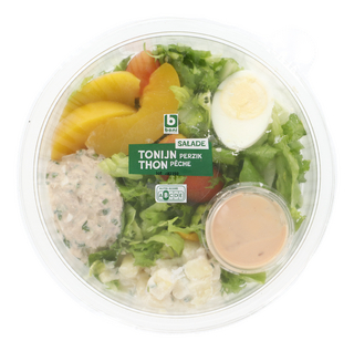 Salade à base de crudités (27%), de pêche, de salade de thon, d'une préparation de pomme de terre avec une sauce cocktail.