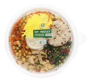 Ingrédients: - Salade de carottes et pois chiches (18 % carotte, 18 % pois chiche, huile de colza, épices, graine de SÉSAME blanc, sel, coriandre), 23 % boulgour préparé [boulgour cuit (eau, semoule de BLÉ dur (gluten)), tomate, persil plat, graine de grenade, tomate mi-séchée, jeune oignon, huile d'olive, menthe, jus de citron, épices, sel], 14 % poulet assaisonné (14 % lanières de poulet, plantes aromatiques et épices, eau, dextrose, sel, arôme naturel, ail), 10 % houmous au citron [4 % pois chiche, eau, huile de colza, graine de SÉSAME, épices, sel, ail, 0,2 % jus de citron, amidon modifié, antioxydant (E330), conservateur (E202), stabilisant (E415), correcteurs d'acidité (E270, E260)], 8,3 % vinaigrette aux graines de sésame [eau, huile de colza, yaourt en poudre (LAIT), jaune d'ŒUF, 1 % graine de SÉSAME, vinaigre, sucre, graine de MOUTARDE, sel, ail, zeste de citron, extrait d'épice, amidon, stabilisant (E415), correcteur d'acidité (E270)], 6 % pain pita [farine de BLÉ (gluten), eau, sel, levure, fibres de betterave]. Peut contenir des traces de gluten (avoine), de crustacés, de poisson, d'arachides, de soja, de tous les types de fruits à coque, de céleri et de mollusques.