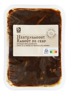 Ingrédients: 40 % viande de cerf, oignon frit [oignon, huiles végétales (navette, tournesol, en proportion variable)], eau, 13 % bière (ORGE), huile végétale [huile de tournesol, émulsifiant (E322), arôme], 2 % confiture de groseille rouge [jus de groseille à base de concentré, sucre, sirop de glucose-fructose, gélifiant (E440), correcteur d'acidité (E330)], concentré de tomate, cassonade [sucre, sirop de sucre inverti, colorant (E150d)], liant [amidon modifié, stabilisants (E412, E415), dextrose], moutarde (eau, graine de MOUTARDE, vinaigre d'alcool, sel, curcuma), gélatine de porc, sel, sucre caramélisé, fond de bœuf et gibier [bouillon concentré de bœuf et de gibier (viande de bœuf, viande de cerf, sel, eau, extrait de bœuf, graisse de bœuf), maltodextrine, extrait de levure, dextrose, extraits de plantes (ail, oignon, piment, marjolaine, sauge, laurier), extrait de vin rouge, purée de tomate], extrait de levure, plantes aromatiques et épices. Peut contenir des traces de gluten (blé, seigle, avoine), de crustacés, d'œufs, de soja, de lait, de tous les types de fruits à coque, de céleri, de sésame, de lupin, de mollusques et de sulfites.