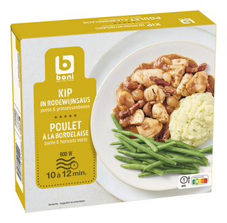 Ragoût de poulet en sauce au vin rouge avec pommes de terre écrasées et haricots verts, surgelé