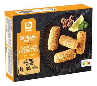 Ingrédients: LAIT, 20% crevette (CRUSTACÉS), bisque de crevette [eau, tomate, oignon, carotte, CÉLERI, jus de tomate, vin blanc, plantes aromatiques, épices, sel, antioxydant (E330), carapace de crevette (CRUSTACÉS)], farine de BLÉ (gluten), beurre (LAIT), eau, amidons, jaune d'ŒUF, huile de navette, sel, plantes aromatiques, épices, gélatine de bœuf, colorants (E150, E160b(ii)]. Peut contenir des traces de gluten (seigle, orge), de poisson, de soja, de moutarde et de mollusques.