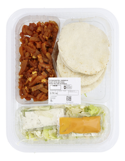 Ingrédients: 40% émicées de porc pita [93% viande de porc, eau, sirop de glucose, sel, protéines de LAIT, épices, arômes (contient CELERI), dextrose, antioxidationsmittel: E300/ E301, épaississants: E407/ E410, fibres de chicorée], 27% pain pita (farine de BLE, eau, levure, sel), sauce [eau, huile de navette, sucre, vinaigre, yaout (LAIT), amidon de maïs, ail, sel, graines de SESAME, vinaigre, jaune d'OEUF, purée de tomates, maltodextrine, whiskey, plantes aromatiqes, épaississants: E412/ E410/ E415, correcteur d'acidité: E330, conservateurs: E202/ E211, antioxidants: E385/ E224, colorant: E160c, arômes], laitue Iceberg, choux blanc. Peut contenir de céréales contenant de gluten (orge, seigle), soja et graines de sésame.