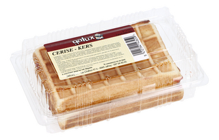Préparation à la cerise (50 %)(cerise (73%, sucre, amidon modifié mais), Farine de FROMENT(GLUTEN), Sucre, Margarine( eau, huiles végétales(palme et colza)), Eau, Poudre de Lait, Bicarbonate de sodium, Sel, Levure. Peut contenir des fragments de noyaux.