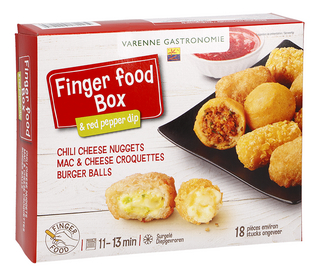 Burger ball : bouchées garnies d'une farce (49, 6%) à base de boeuf, cornichon etcheddar, enrobées d'une panure (50,4%), préfrites, surgelées, à cuire, 120 g.Ingrédients : eau, farine de blé, viande de boeuf cuite 15,4% (origine UE, Royaume-Uni),cornichon au vinaigre 11,5% (cornichon 11,3%, vinaigre d'alcool, eau, sel), farine de maïs,préparation à base de tomates (tomate semi-déshydratée, huile de colza, sel, origan, ail),oeuf, cheddar 4,4% (LAIT), purée de tomates double concentrée, oignon, sucre, LAIT entier enpoudre, huile de colza, sel, amidon modifié de pomme de terre, ail, fécule de pomme deterre, protéine de LAIT, beurre (LAIT), émulsifiant : citrate de sodium ; poudres à lever :carbonates de sodium, diphosphate disodique ; poivre, levure, poudre de psyllium, fibresd'agrumes, farine de lin partiellement déshuilée, dextrose. Huile de friture : huile de colza.Mac & cheese : bouchées garnies d'une farce (58%) à base de cheddar, fromage fraiset pâtes cuites, enrobées d'une panure (42%), préfrites, surgelées, à cuire, 120 g.Ingrédients : eau, farine de blé, cheddar 12,7% (LAIT), fromage frais 11,1% (LAIT écrémé,babeurre (LAIT), crème (LAIT), protéines de LAIT, babeurre (LAIT) déshydraté, ferments lactiques(LAIT)), semoule de blé dur 7,8%, maïs, LAIT entier en poudre, amidon modifié de pomme deterre, fécule de pomme de terre, protéine de LAIT, beurre (LAIT), amidon de blé, sel,émulsifiant : citrate de sodium, farine de maïs, levure, sucre, oeuf entier en poudre,caséinates de sodium (LAIT), paprika en poudre, curcuma en poudre, extrait de malt d'orge,gluten de blé, poudre à lever : bicarbonate de sodium, poivre, extrait d'ail, extrait d'oignon.Huile de friture : huile de colza.Chili cheese nuggets : bouchées garnies d'une farce(46,1%) à base de cheddar, poivrons et piment, enrobées d'une panure (53,9%),préfrites, surgelées, à cuire, 120 g. Ingrédients : eau, farine de blé, cheddar 15,5% (LAIT),poivron, amidon modifié de pomme de terre, piment jalapeños au vinaigre 4% (jalapeños3,7%, vinaigre d'alcool, sel, agent affermissant : chlorure de calcium, épices), dextrine depomme de terre ; protéine de LAIT, beurre (LAIT), fécule de pomme de terre, émulsifiant :citrate de sodium, sel ; poudres à lever : carbonates de sodium, diphosphates ;épaississants : méthylcellulose, gomme xanthane ; dextrose, levure, épices. Huile de friture :huile de colza. Sauce : sauce au poivron et au piment, 50 g. Ingrédients : sucre, eau,poivrons 2,5%, piments 2,5%, amidon de maïs modifié, vinaigre d'alcool, jus concentré depommes, sel, acidifiant : acide citrique. Les pourcentages sont exprimés sur le total de chaque recette.