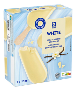 71 % glace à la vanille, enrobée de 29 % chocolat blanc