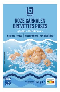 Ingrédients: 98,6 % crevette (CRUSTACÉS) [Xiphopenaeus kroyeri, pêchée au chalut dans l’Atlantique Centre-Ouest (FAO 31)], sel, correcteur d’acidité (E331), colorant (E160a), conservateur [E223 (SULFITES)].