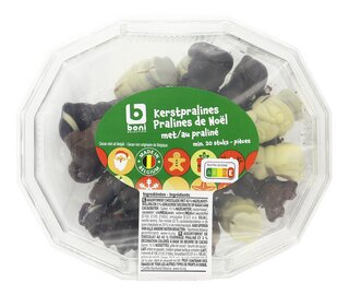 Assortiment de chocolat avec fourrage confiseur aux noisettes (43%) et décoration colorée 3% à base de beurre de cacao
