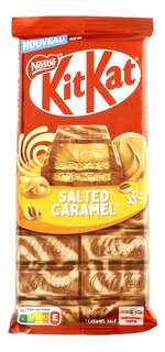 Gaufrette croustillante enrobée de chocolat au lait (50.7%) aromatisé au caramel et d'un enrobage blanc (11.9%) avec un fourrage (20.3%) au caramel salé aromatisé.