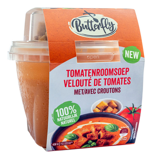 Ingrédients: eau, 28% purée de tomates d'origine de concentré de tomates, 7,0 % croûtons (farine de BLé (GLUTEN), huile de tournesol, eau, GLUTEN DE BLé, sel, sucre, levure), carotte, CéLERI-rave, 5,4 % crème de cuisson (LAIT, CRèME, amidon), oignon cuit, poireau, amidon de riz, sucre de canne, sel marin, arômes naturels (contient OEUF), poivre blanc. Peut contenir des traces de soja.