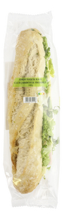 Baguette blanche au jambon, fromage, mayonnaise et mix de salade verte.