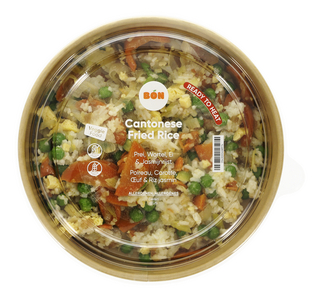 Riz jasmin, blanc de poireaux, carotte orange, huile de tournesol, oignons blancs hachés, petits pois, oeufs liquides, purée d'ail, poudre de gingembre, sel, poivre noir