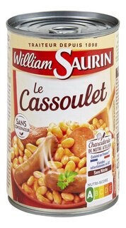 Ingrédients : Haricots blancs précuits 33%, eau, saucisses fumées et saucisson (viande et gras de porc, eau, pièces de tête de porc, viande de dinde, farine de BLÉ, fibres de pois, sel, protéines de SOJA, couenne de porc, gélifiant : E407a), viande de porc préparée en salaison (viande de porc, eau, sel, amidon modifié de maïs), saindoux, triple concentré de tomate, farine de BLÉ, sel, sucre, arômes naturels, affermissant: chlorure de calcium. Total charcuterie et viande mise en oeuvre : 22%. Viandes d'origine Union EuropéennePeut contenir des traces de : LAIT.