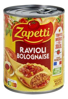 Eau, ravioli 28,5% (semoule de BLE dur, eau, viande bovine 5,1%, chapelure (dont GLUTEN), sel, épices et plantes aromatiques), purée de tomate mi-réduite 12%, viande bovine 9,9%, carotte 2,5%, tomate pelée, oignon 0,9%, sucre, arômes naturels, vin blanc, sel, amidon de maïs, huile de tournesol.Fabriqué dans un atelier utilisant : oeuf, lait, céleri.