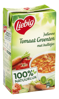 Ingrediënten: water, tomatenpuree op basis van concentraat 20%, ui, wortel, gekookte VERMICELLI 4,7% (TARWEBLOEM (GLUTEN), EI-eiwit), prei, KNOLSELDERIJ, soepballetjes 2,5% (varkens- en rundsvlees, PANEERMEEL(TARWE (GLUTEN), gist), zout, specerijen en kruiden), maïszetmeel, zout, koolzaadolie, aroma’s (bevat selderij). Kan sporen van melk bevatten. Bevat 43% groenten.
