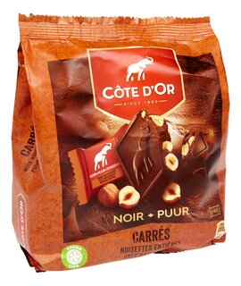 Pure chocolade met hele hazelnoten (20%).