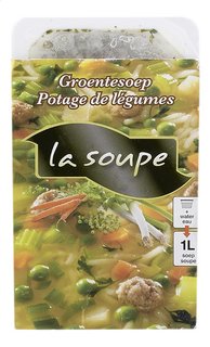 water, groenten (15%) [SELDERIJ, prei, erwten, wortelen, aardappelen, kervel], soepballetjes (2,5%) [varkensvlees, kippenvlees, broodkruim (TARWE), zout, specerijen], bouillon [gehydrolyseerd SOJA-eiwit, zout, gistextract, specerijen], rijst, verdikkingsmiddel: xanthaangom.