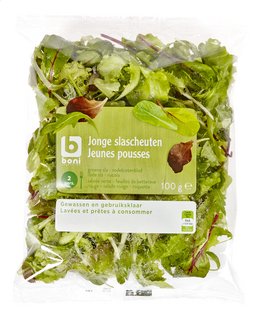 Jongescheuten van groene sla,rodebietenblad, rode sla,rucola.