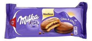 Zachte cakejes met cacaovulling (24 %) omhuld met melkchocolade (32 %) (van Alpenmelk).
