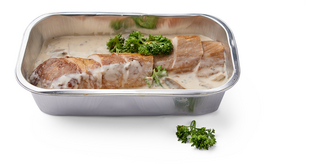 Ingrediënten: 49,6 % champignonroomsaus [water, MELKconcentraat, 18,4 % champignon, zetmeel, MELKpoeder, TARWEbloem, zout, aroma (SOJA), porto (SULFIET), whiskey (SULFIET), zonnebloemolie, glucosestroop, kruiden en specerijen, gistextract, maltodextrine, suiker], 49,6 % varkenshaasje [varkensvlees, zout, specerijen (peper), aroma, plantaardige olie (zonnebloem, koolzaad)], 0,8 % peterselie. Bevat: gluten (tarwe), melk, soja, sulfiet.Kan sporen bevatten van: eieren, selderij, mosterd.