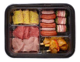 Assortiment pure en gemarineerde stukjes rund-, varkens- en kippenvlees, met zoetstof