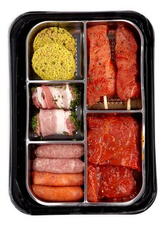 Assortiment kleine gemarineerde biefstukken (25,9 %), chipolata’s (11,5 %), merguez-worsten (11,5 %), burgers (14,4 %), blinde vinken (19,6 %) en gemarineerde varkensbrochettes (17,2 %)