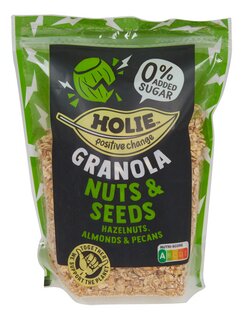 Ingrediënten: VOLKOREN HAVERVLOKKEN, VOLKOREN GERSTVLOKKEN, VOLKOREN SPELTVLOKKEN, plantaardige vezels, HAZELNOTEN (5%), AMANDELEN (5%), zonnebloempitten (5%), PECANNOTEN (3%), pompoenpitten (2%).Kan sporen van pinda's en soja bevatten.