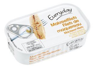 Ingrediënten : [Scomber scombrus, met trawlnetten of ring- en kruisnetten gevangen in de Noorse zee, de noordelijke Noordzee of westelijk van Schotland (FAO 27.lla, IVa, Vla)], 25,2 % koolzaadolie, water, zout.