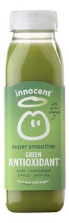 ½ geperste appel (64%), ½ geplette banaan (11%), 5 geperste witte druiven (9,4%), ¼ geplette mango (6,8%), ¼ geplette kiwi (6,1%), wat geplette komkommer (1,5%), een scheutje spirulina-extract, wat gemalen lijnzaad (0,2%), een scheutje limoensap (0,15%), een drupje kurkuma-extract, een scheutje matchathee-infusie (0,05%), wat vitamines (B1, B2, B6, C, E, niacine)
