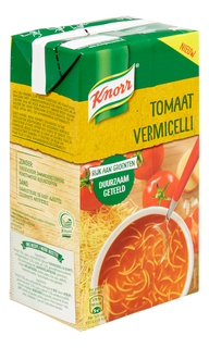 Ingrediënten: Tomaat¹ 55%, water, vermicelli 1,6% (harde TARWEGRIES, gedroogd EI-EIWIT), suiker, ui¹ 1,3%, gemodificeerd zetmeel, zout, aardappelvlokken¹ 0,5%, zonnebloemolie, KARNEMELKPOEDER, gistextract, magere MELKPOEDER, aroma, zwarte peper. Kan selderij, mosterd, soja, andere glutenbevattende granen bevatten. ¹op duurzame wijze geteeld.