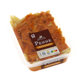 Ingrediënten: 39,5 % gekookte penne [griesmeel van harde TARWE (gluten), water, EI-eiwit, koolzaadolie, zout], water, 12,5 % gegrilde kip [kipfilet, lactose (MELK), antioxidant (E331), zout, SOJA-eiwitten, stabilisator (E451), geleermiddel (E407), MELKeiwitten], 8,5 % mascarpone (MELK), 8 % tomaten, 3 % tomatenconcentraat,2 % uien, koolzaadolie, gemodificeerd zetmeel, aroma (SELDERIJ), suiker, runderbouillon (zout, suiker, aroma’s, zetmeel, specerijen, rundvlees), zout specerij-extract, dextrose, kruiden,0,05 % knoflook, specerijen, kandijstroop.