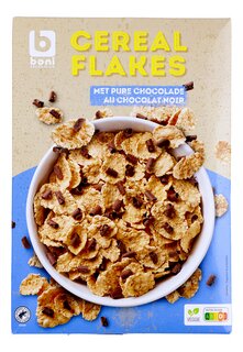 Vlokken van rijst, volkoren tarwe en gerst met purechocoladeschilfers