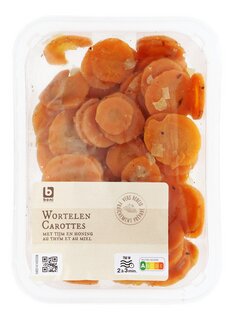 Ingrediënten: 82 % wortelen, uien, 4 % honing, zonnebloemolie, zout, 0,2 % tijm, gemodificeerd zetmeel, peper. Kan sporen van gluten (tarwe), schaaldieren, eieren, vis, soja, melk, selderij, mosterd, sesam en weekdieren bevatten.