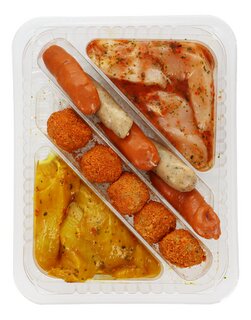 Assortiment gemarineerde of gekruide stukjes kippenvlees, met toegevoegd water