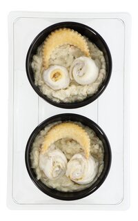 Ingrediënten: SCHARrolletjes 47%, ROOM, water, ajuin, bladerdeeg 3% (TARWEbloem, water, palmvet, raapzaadolie, zout, emulgator: E471, citroensapconcentraat, EI), wortel, knolSELDER, visbouillon (VISbouillon, dextrose, raapzaadolie, maltodextrine, zout, maïszetmeel, peper, laurier, tijm), witte wijn 1,7%, courgette, sjalot, gemodificeerd zetmeel, sherry, noilly prat, bieslook, citroensap, zonnebloemolie, gelatine, zout, look, peper, laurier, stabilisatoren: E406, E407, conserveermiddel: E224. Kan sporen bevatten van mosterd, soja, sesam, schaal- en weekdieren.