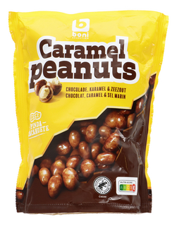 Ingrediënten: 64 % witte chocolade met karamel [suiker, cacaoboter¹, volleMELKpoeder, 2% karamelpoeder (magereMELKpoeder, sacharose), magereMELKpoeder, cacaomassa¹, emulgator (E322), natuurlijk aroma, zout], 33% PINDA’S, 1% pure chocolade [cacaomassa¹, suiker, cacaoboter¹, watervrij MELKvet, emulgator (E322 (SOJA)), natuurlijk vanille-aroma], 0,7% zeezout, glucosestroop, dextrine, emulgator (E414), glansmiddel (E904). Kan sporen van alle noten en sesam bevatten.