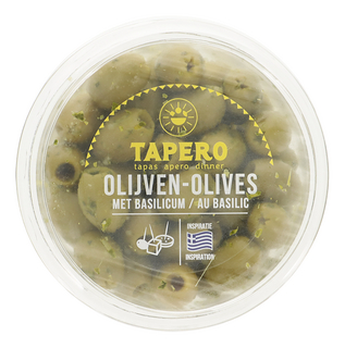 Ingrediënten: 96% groene ontpitte olijven (olijf, zout, voedingszuren: melkzuur, citroenzuur), 2.8% basilicum, zonnebloemolie, knoflook, conserveermiddel: kaliumsorbaat, zout, antioxidant: ascorbinezuur. Ondanks zorgvuldige controle kan dit product nog pitten bevatten.