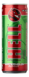 HELL WATERMELOEN - Watermeloen en tutti-frutti smaak, cafeïnehoudende, vitamine-verrijkte, koolzuurhoudende, non-alcoholische drank. Gepasteuriseerd.
