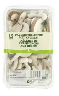 Mengeling van gesneden paddenstoelen (95 %), lente-ui (4%) en bieslook